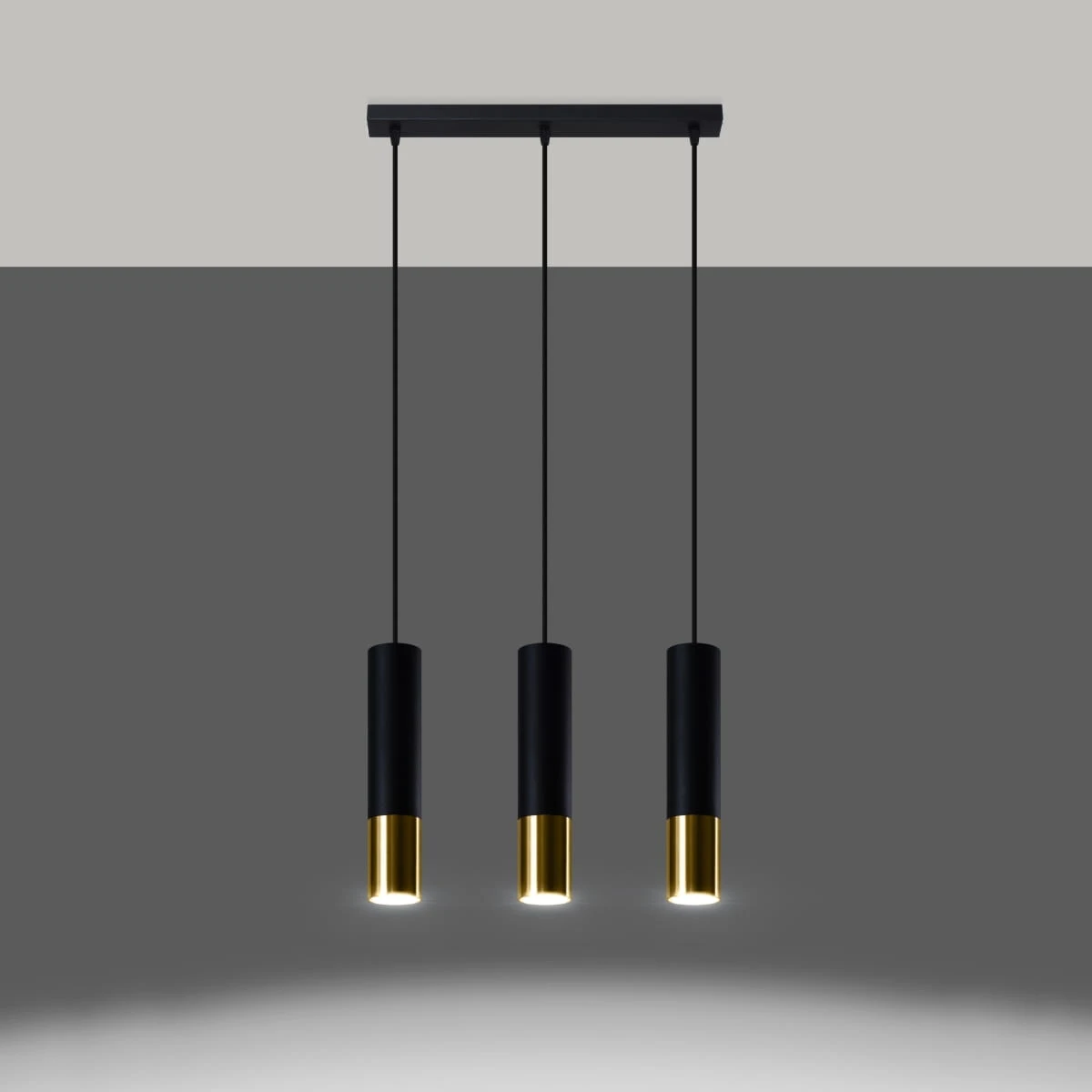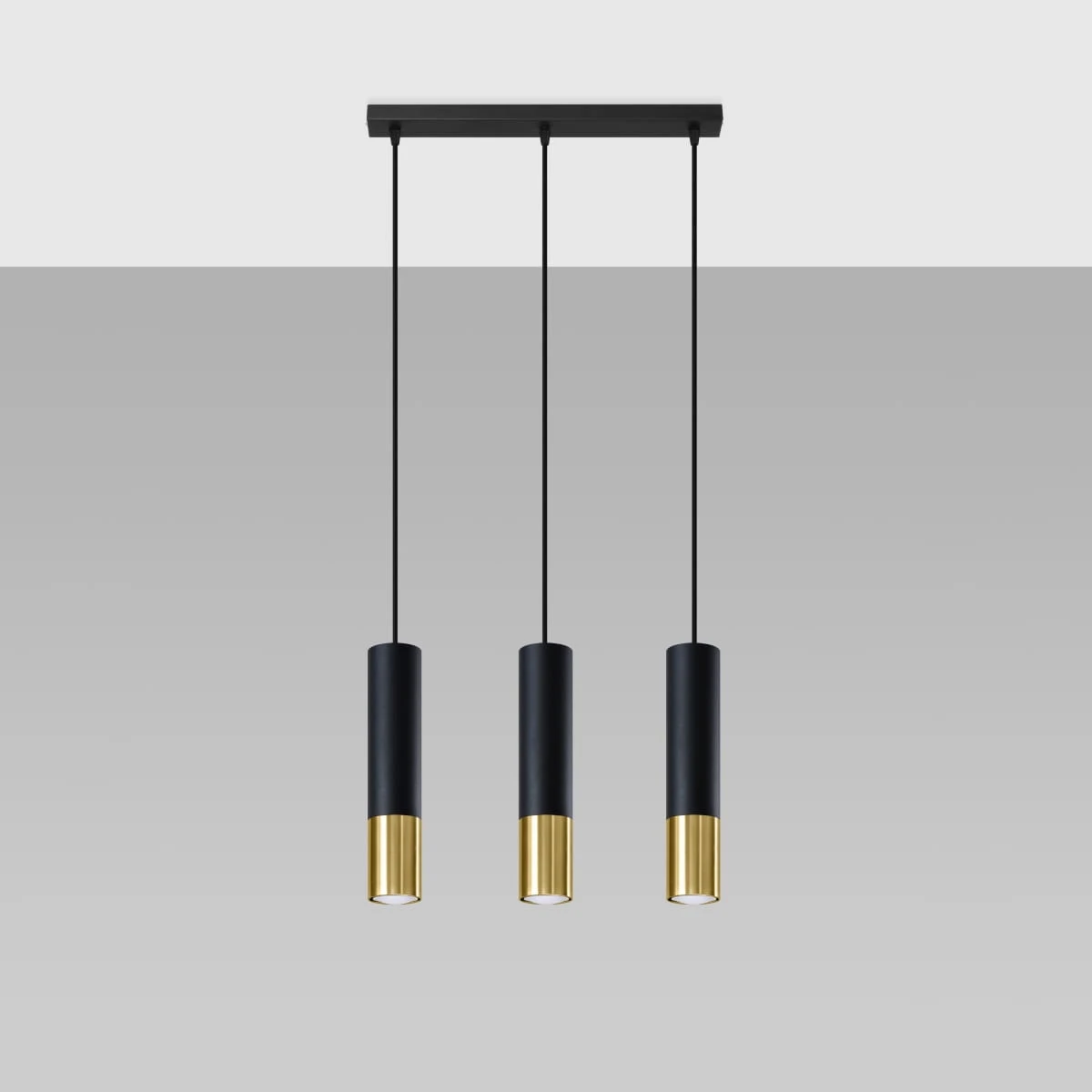 Źródło światła: GU10, 3x max 10W LED, ~230V, 50Hz, IP20, klasa ochronności I Źródło światła nie jest w komplecie. Wymiary: 45/6/90 cm Wymiary klosza: 6/29 cm Materiał: stal Kolor: czarny, złoty