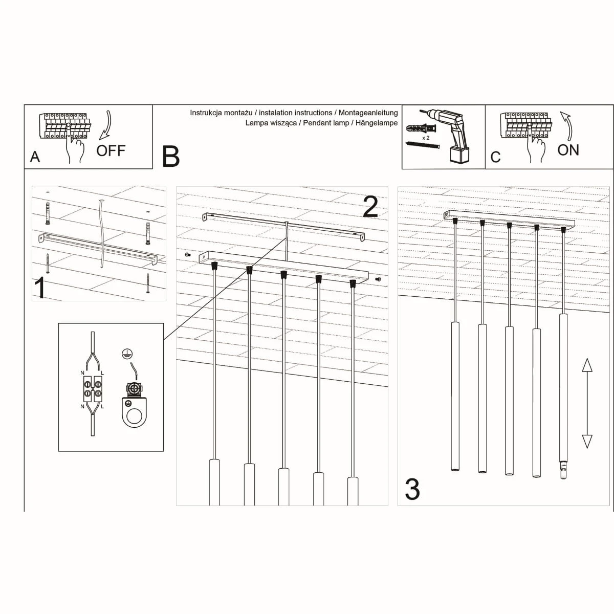 Źródło światła: G9, 5x max 8W LED, ~230V, 50Hz, IP20, klasa ochronności I Źródło światła nie jest w komplecie. Wymiary: 45/5/90 cm Wymiary klosza: 2,5/50 cm Materiał: stal Kolor: czarny