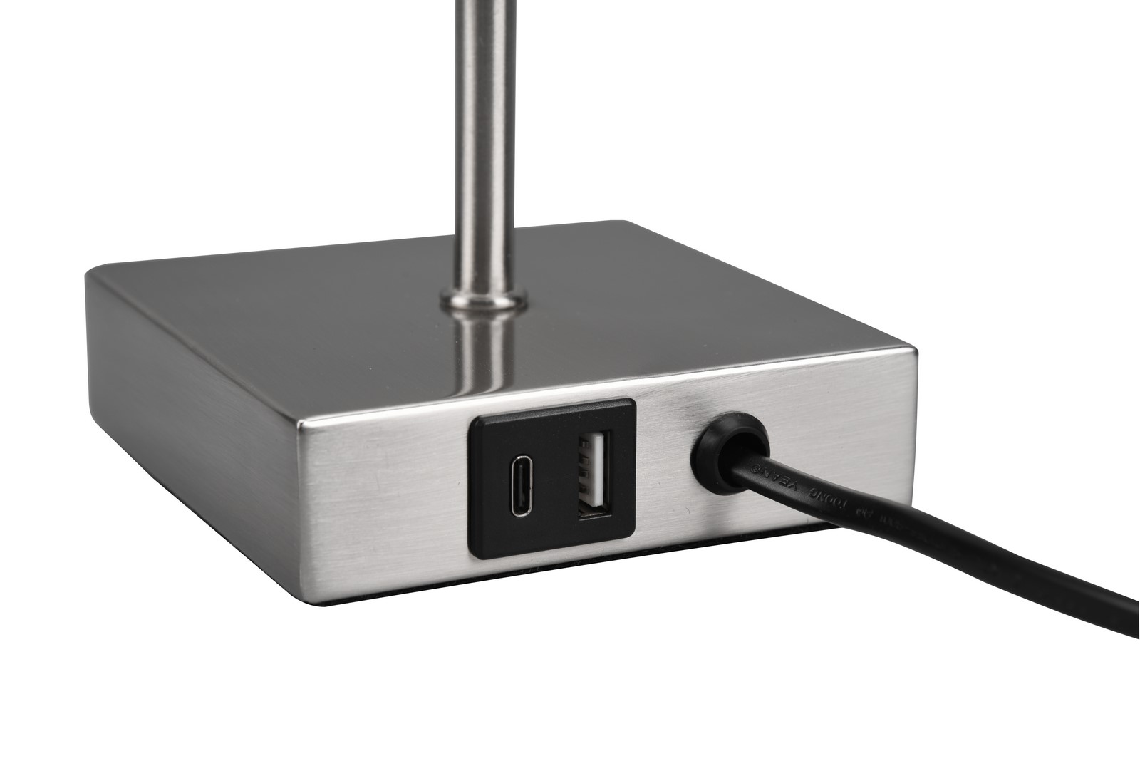 OLE lampa stołowa, kolor nikiel mat. Złącza USB oraz USB-C z funkcją ładowania.