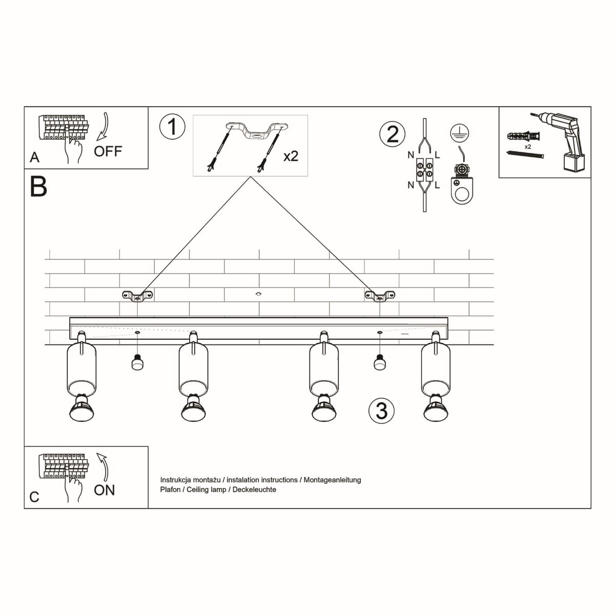 Źródło światła: GU10, 4x max 10W LED, ~230V, 50Hz, IP20, klasa ochronności I Źródło światła nie jest w komplecie. Wymiary: 80/6/16 cm Materiał: stal Kolor: czarny