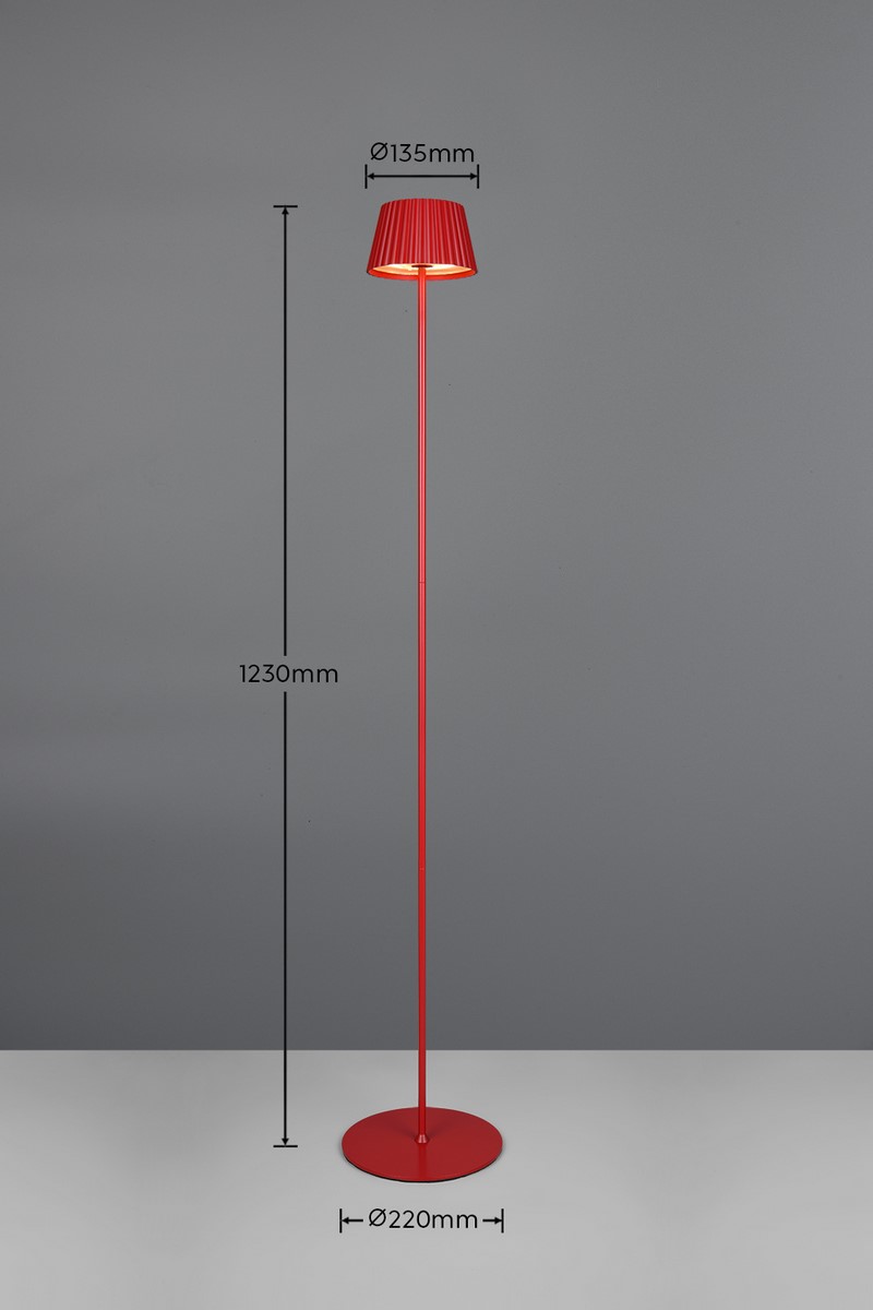 SUAREZ Kolor czerwony. IP44. Funkcja dotykowa On/Off. Akumulator ładowany przez złącze USB-C. Czas ładowania 4,5h, czas świecenia 6h. Bezstopniowe ściemnianie za pomocą funkci dotykowej. IP44
