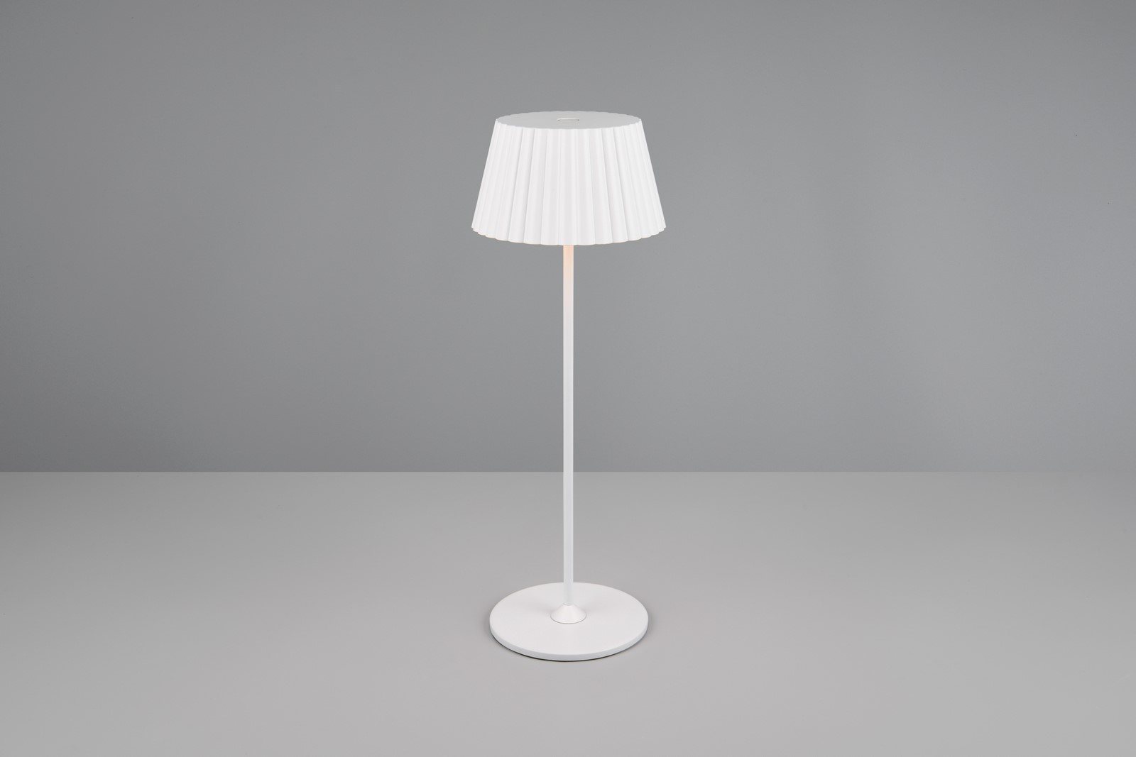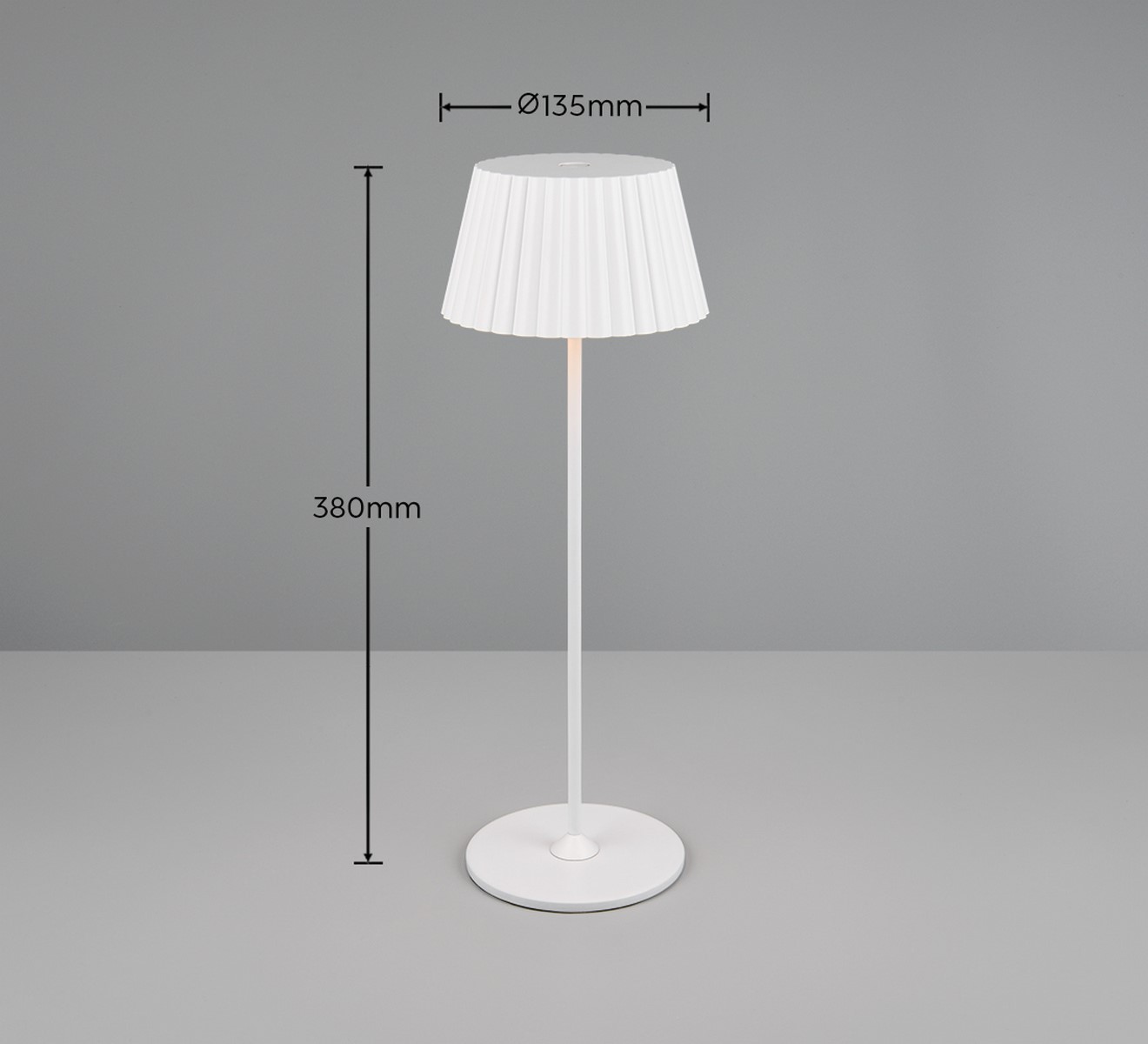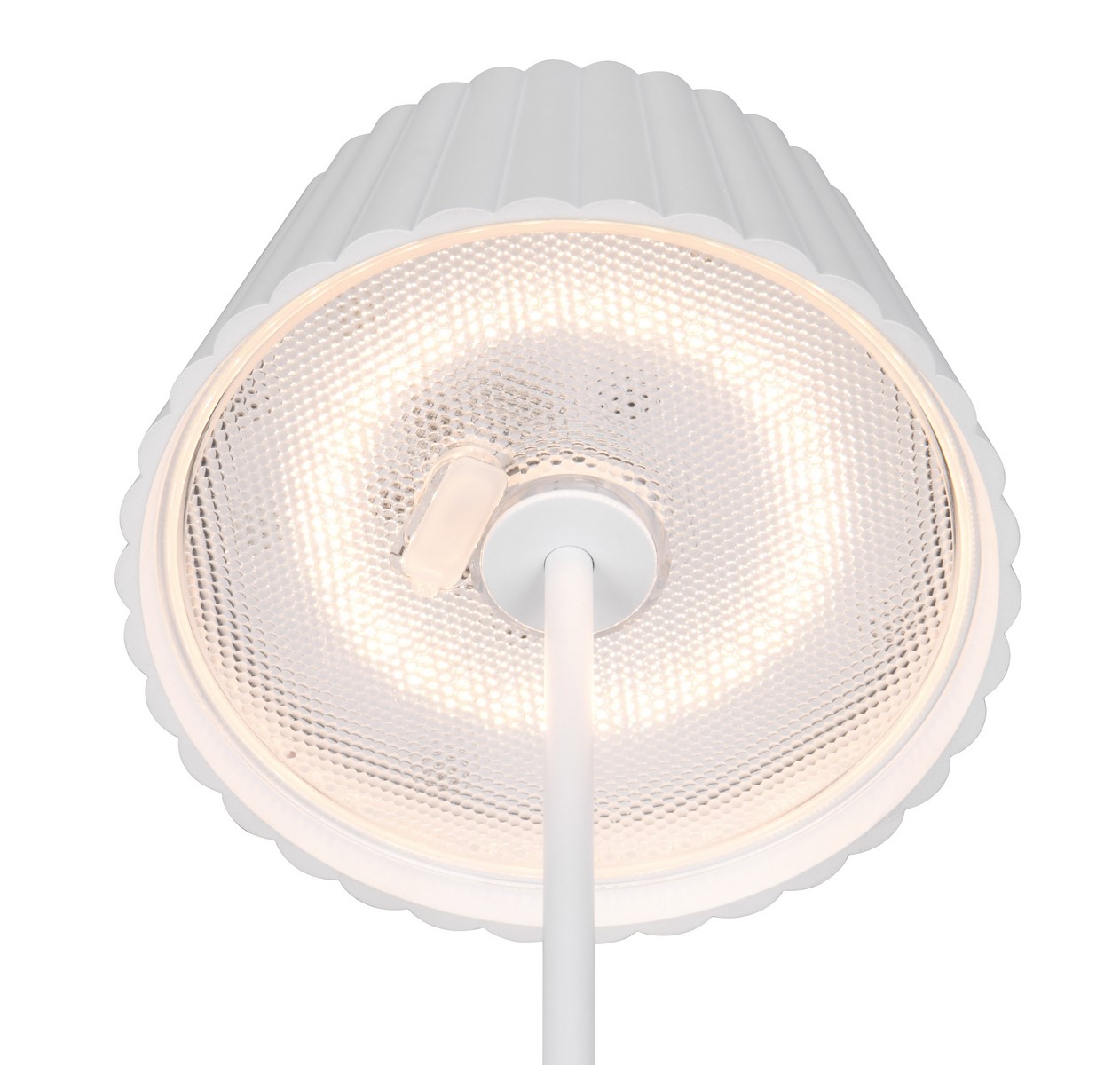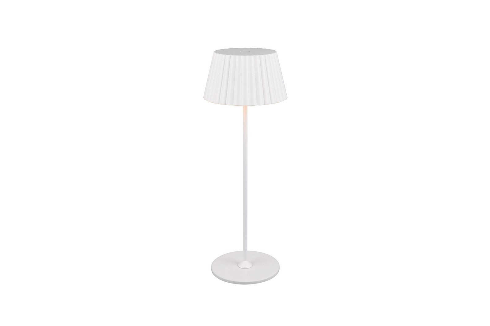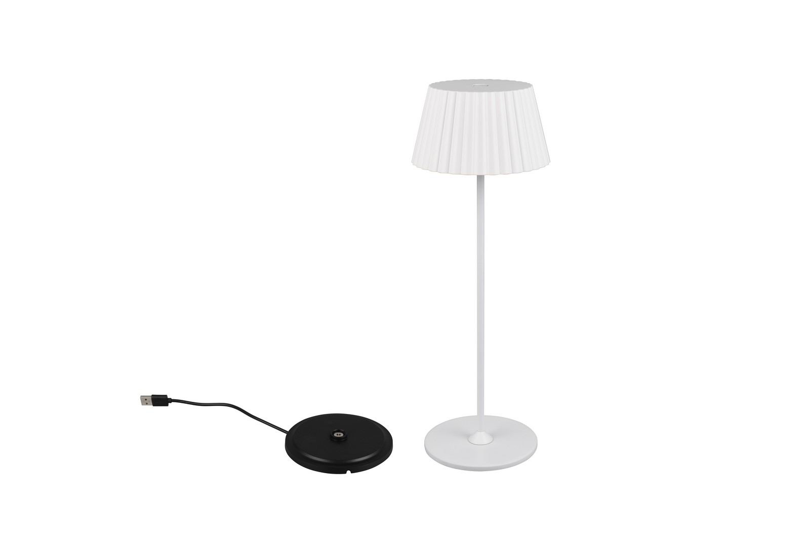 SUAREZ Kolor biały mat. IP44. Funkcja dotykowa On/Off. Akumulator ładowany przez złącze USB-C. Czas ładowania 4,5h, czas świecenia 6h. Ściemniana za pomocą funkcji dotykowej. Stacja ładowania w zestawie. IP44